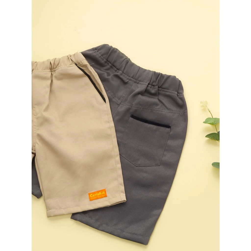 Celana pendek anak Ceriakid dengan bahan twill. bahan yang memang dibikin khusus untuk celana jadi lebih tebal daripada bahan biasanya.