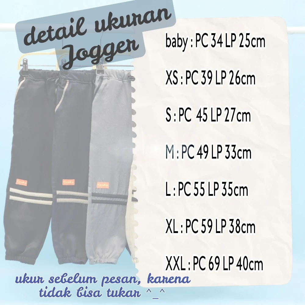 Joger anak Anak Laki laki dan Perempuan original dari ceriakid tersedia dari bayi – 9 tahun. Ukuran ada di sebelah kanan saat klik varian ya, pastikan selalu cek karena beda anak beda besar.